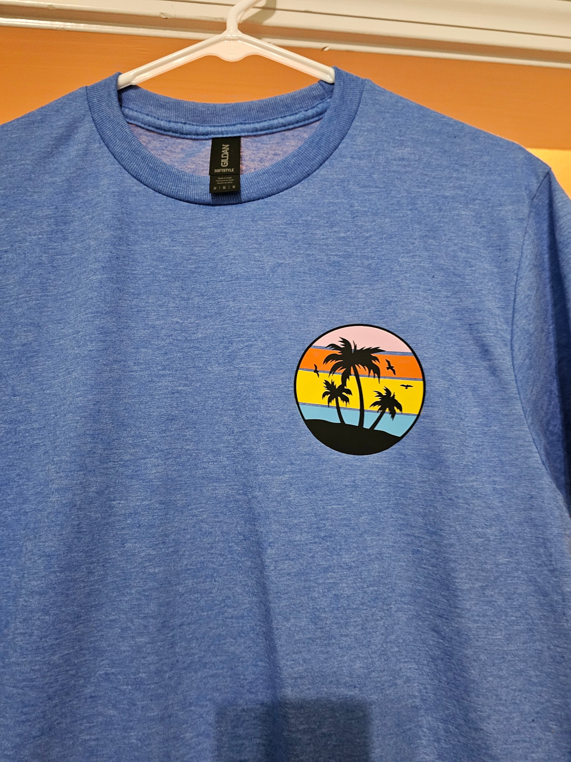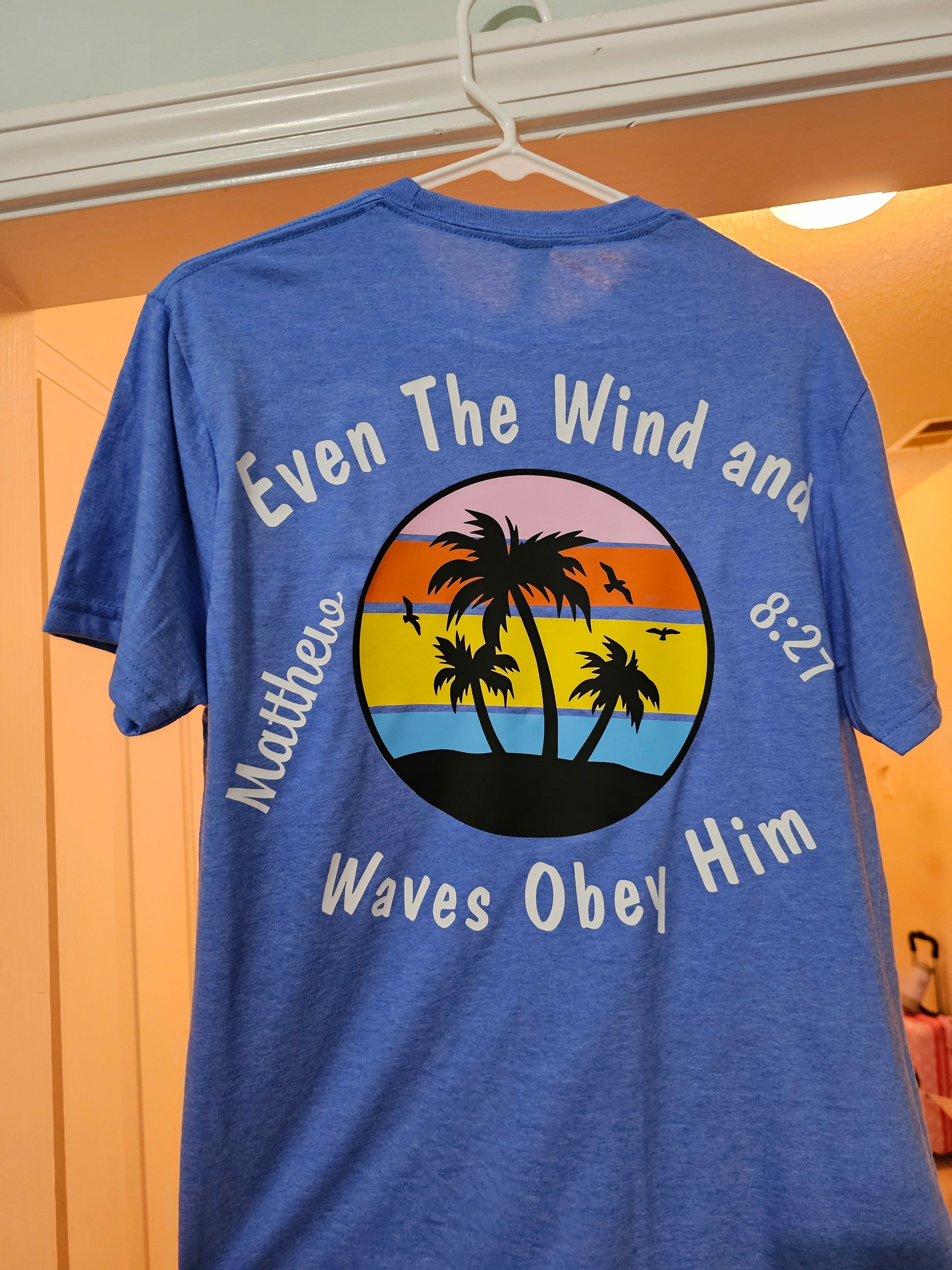 You will feel closer to the beach with this design. The shirt features Matthew 8:27 Even the wind and the waves obey him and a multi-color sunset design behind palm trees and birds flying. There is a smaller version of the sunset as a pocket design on the front.